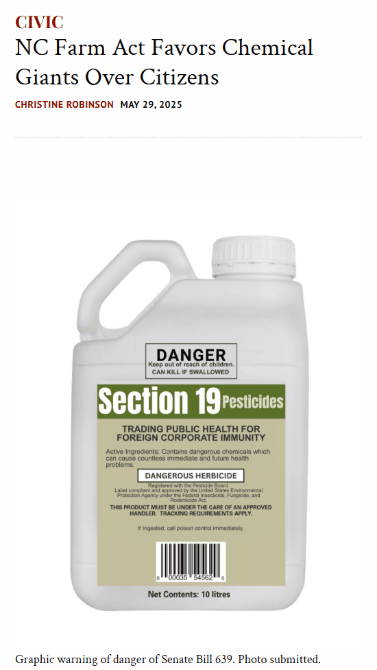 Bayer has been especially sneaky in NC. They snuck their language into the 2025 Farm Act as Section 19.